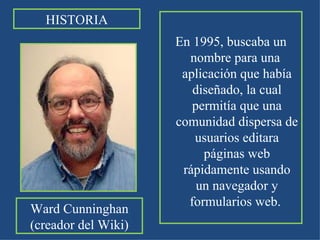 Este documento describe la historia y características de los wikis. Ward Cunningham creó el primer wiki en 1995 para permitir que una comunidad en línea editara páginas web rápidamente. Tomó el nombre "wiki" de los autobuses de aeropuerto en Hawái. Los wikis permiten que cualquier persona edite, escriba, guarde y comparta información de forma colaborativa. Se caracterizan por ser de fácil edición y no tener una estructura predefinida. Los wikis se pueden utilizar para enciclopedias, proyectos grupales, bases de