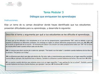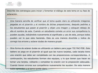 El documento describe un tema que los estudiantes tienen dificultades para aprender, el uso de las preposiciones en inglés como "en", "on" y "at". Explica el significado y uso de cada preposición y propone dos estrategias para aclarar el tema: 1) usar imágenes pegadas en el pizarrón y pedir a los estudiantes que coloquen la preposición correcta, y 2) jugar un juego de completar oraciones en un tablero para practicar. También sugiere dos estrategias para fomentar la argument