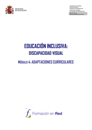 El documento habla sobre la educación inclusiva para alumnos con discapacidad visual. Explica que la mayoría de estos alumnos están incluidos en la enseñanza ordinaria y siguen el currículo regular con adaptaciones. Detalla algunas características del alumnado con discapacidad visual y factores como el grado de visión, tipo de discapacidad, momento de aparición y presencia de otras discapacidades que afectan sus necesidades educativas. El objetivo principal es adecuar la enseñanza a cada alumno a través de