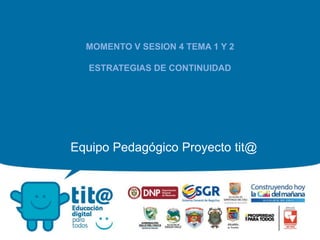El documento presenta estrategias de continuidad para el desarrollo profesional docente mediante el uso de las TIC. Propone tres caminos y destaca el acompañamiento in situ como estrategia clave. Además, presenta una propuesta de capacitación sobre la inserción de TIC en la práctica docente con sesiones temáticas e invita a los docentes a realizar reflexiones finales utilizando herramientas como la Rueda de la Vida y el Pentágono de Competencias para evaluar su progreso.