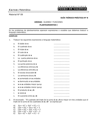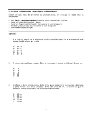 El documento presenta ejemplos y estrategias para resolver problemas de álgebra que involucran traducir enunciados a lenguaje matemático, trabajar con fracciones, números con dígitos, edades, y otros tipos de problemas algebraicos. Se proveen 18 ejercicios de ejemplo para que el lector practique la aplicación de estas estrategias y traducción de enunciados.