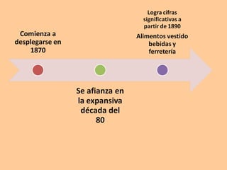 El documento describe el sistema capitalista y el liberalismo económico del siglo XVIII, así como las teorías de Adam Smith, David Ricardo y las ventajas comparativas. Explica cómo el modelo agroexportador en Argentina se basó en la especialización en productos con ventajas comparativas, atrajo capital e inmigrantes extranjeros y llevó a un rápido crecimiento entre 1880-1914. Sin embargo, el modelo también tuvo límites como su dependencia de los mercados y capitales externos.