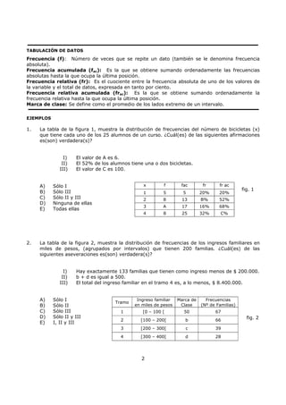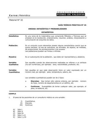 Este documento presenta conceptos básicos de estadística y probabilidad. Define estadística, población, muestra, variables cualitativas y cuantitativas. Explica medidas de tendencia central como la media, moda y mediana. También cubre tabulación de datos, representación gráfica e interpretación de gráficos. Finalmente, incluye ejemplos y ejercicios prácticos sobre estos temas.