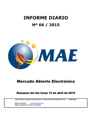 El resumen diario informa sobre los montos negociados y variaciones en los mercados de renta fija, pases, forex y OCT en el MAE del día 13 de abril. Se incluyen gráficos de volúmenes históricos y participación por tipo de instrumento. Se reportan también los índices del MAE en pesos y dólares, así como las curvas de rendimiento y precios de cierre de los principales títulos públicos negociados.