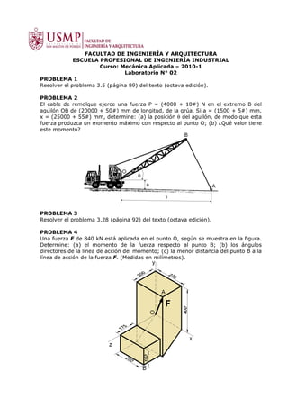 Este documento presenta 6 problemas de mecánica aplicada relacionados con fuerzas y momentos. Los problemas involucran determinar la posición de un aguilón para producir el momento máximo, calcular momentos dados fuerzas y distancias, y calcular componentes de fuerza resultante y momento resultante en un punto dado varias fuerzas y momentos actuando sobre una tubería con ángulos especificados.