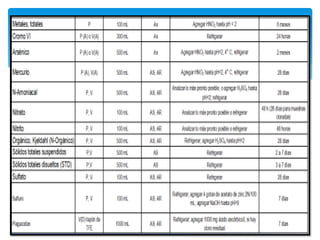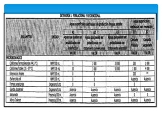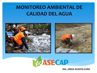 El documento trata sobre el monitoreo de la calidad del agua. Explica que el agua es esencial para la vida y describe su distribución en el mundo. Luego, define la contaminación del agua como la adición de materia extraña que altera su calidad natural, afectando a los seres vivos. Finalmente, detalla los parámetros y equipos utilizados para realizar el monitoreo de la calidad del agua, así como la importancia de preservar correctamente las muestras.