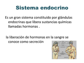 El sistema endocrino está compuesto por glándulas que secretan hormonas hacia la sangre. Existen glándulas endocrinas como la hipófisis, las gónadas, la tiroides, las paratiroides y las suprarrenales, las cuales secretan hormonas directamente a la sangre. Las hormonas son sustancias químicas que regulan, activan e inhiben funciones del organismo como el metabolismo, el crecimiento y las funciones sexuales.