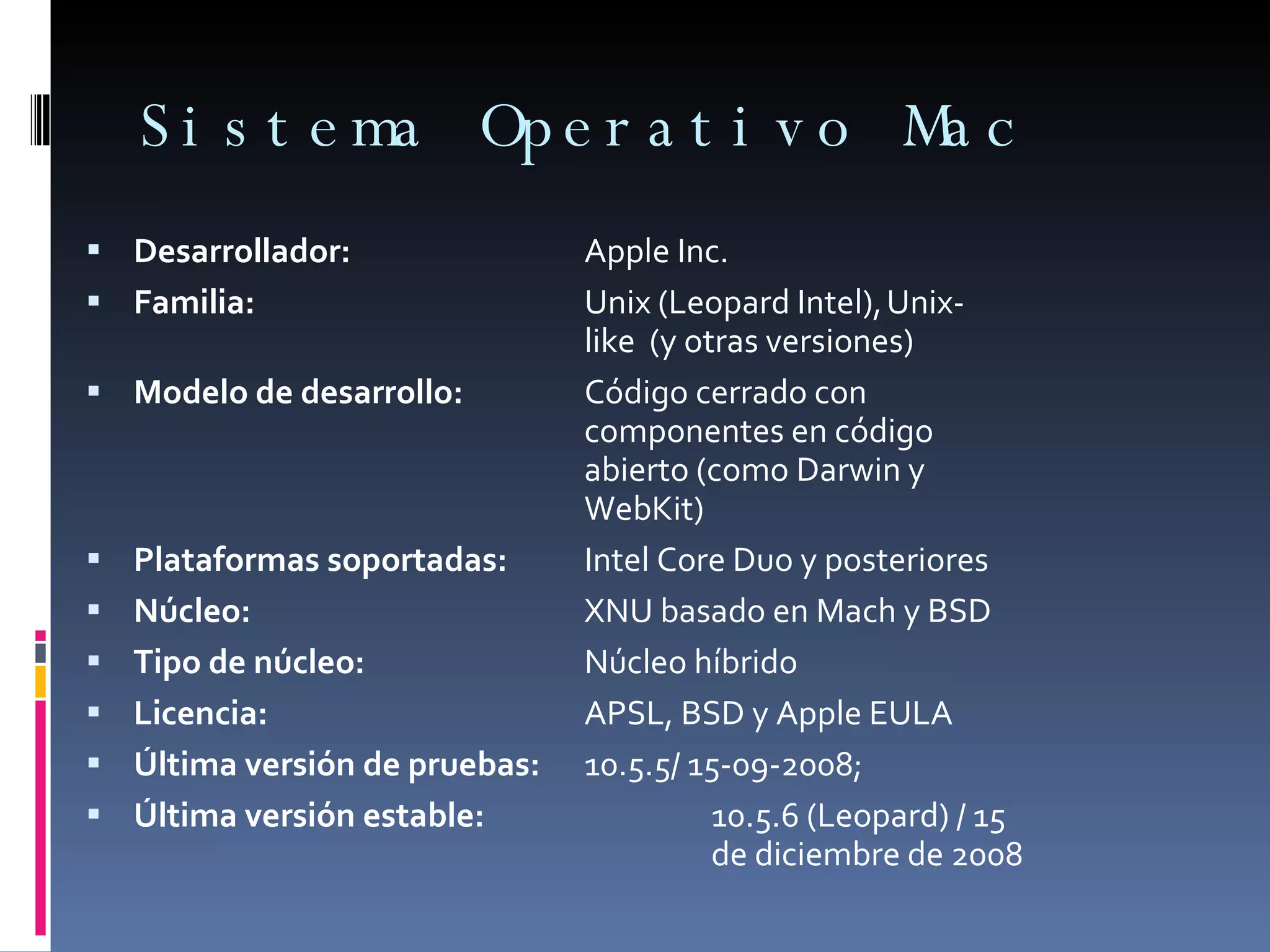 El documento proporciona información sobre el sistema operativo Mac OS X de Apple. Resume las diferentes versiones del sistema operativo desde 1984 hasta la actualidad, los procesadores soportados, el kernel híbrido basado en Darwin, Mach y BSD, y los tipos de licencias utilizadas como APSL, BSD y las licencias de Apple.