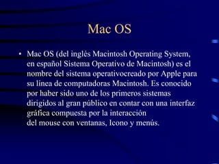 Este documento describe el sistema operativo Mac OS de Apple. Explica que fue uno de los primeros sistemas operativos con interfaz gráfica, y que su desarrollo original incluyó a Bill Atkinson, Jef Raskin y Andy Hertzfeld. También señala que a partir de la versión 10, el sistema cambió a una arquitectura basada en Unix. Finalmente, concluye que Mac OS es uno de los mejores sistemas operativos pero que su principal problema es su alto costo.