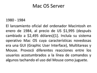 El documento describe el lanzamiento del Macintosh en enero de 1984 por US$1,995, incluyendo su sistema operativo Mac OS. Mac OS presentó una interfaz gráfica de usuario, capacidades multitarea y uso del mouse, características novedosas que fueron criticadas por algunos usuarios acostumbrados a la línea de comandos.