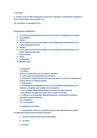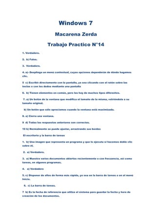 Este documento contiene preguntas y respuestas sobre diversos temas relacionados con Windows 7. En resumen, cubre aspectos como el escritorio, la barra de tareas, el explorador de archivos, la búsqueda, la papelera de reciclaje, aplicaciones incluidas, la ayuda, la impresora, personalización, configuración de ratón y panel táctil, instalación y desinstalación de programas, agregar hardware nuevo, y configuración de usuarios y control parental.