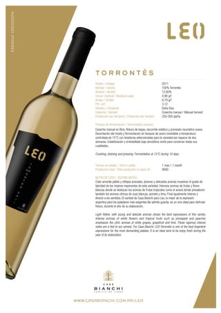 Este documento describe un vino tinto argentino del 2011 llamado Torrontés producido por Casa Bianchi. El vino es un 100% Torrontés cosechado a mano de la viña Doña Elsa con una producción de 250-300 qq/ha. Fue fermentado a 15°C durante 2 semanas y embotellado bajo atmósfera inerte para conservar sus cualidades. El vino tiene un color amarillo pálido con aromas florales y tropicales como piña y durazno con notas cítricas de uva blanca,
