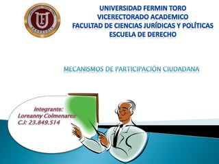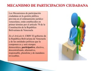 La Constitución venezolana establece varios mecanismos de participación ciudadana en la gestión pública como el referéndum, la iniciativa legislativa y la revocatoria de mandatos. Reconoce la participación como un derecho de los ciudadanos y establece que el Estado y la sociedad deben facilitar su ejercicio en todas las etapas del proceso de toma de decisiones, desde la planificación y ejecución hasta el control y evaluación de las políticas públicas, especialmente en áreas como la salud, la economía de los pue