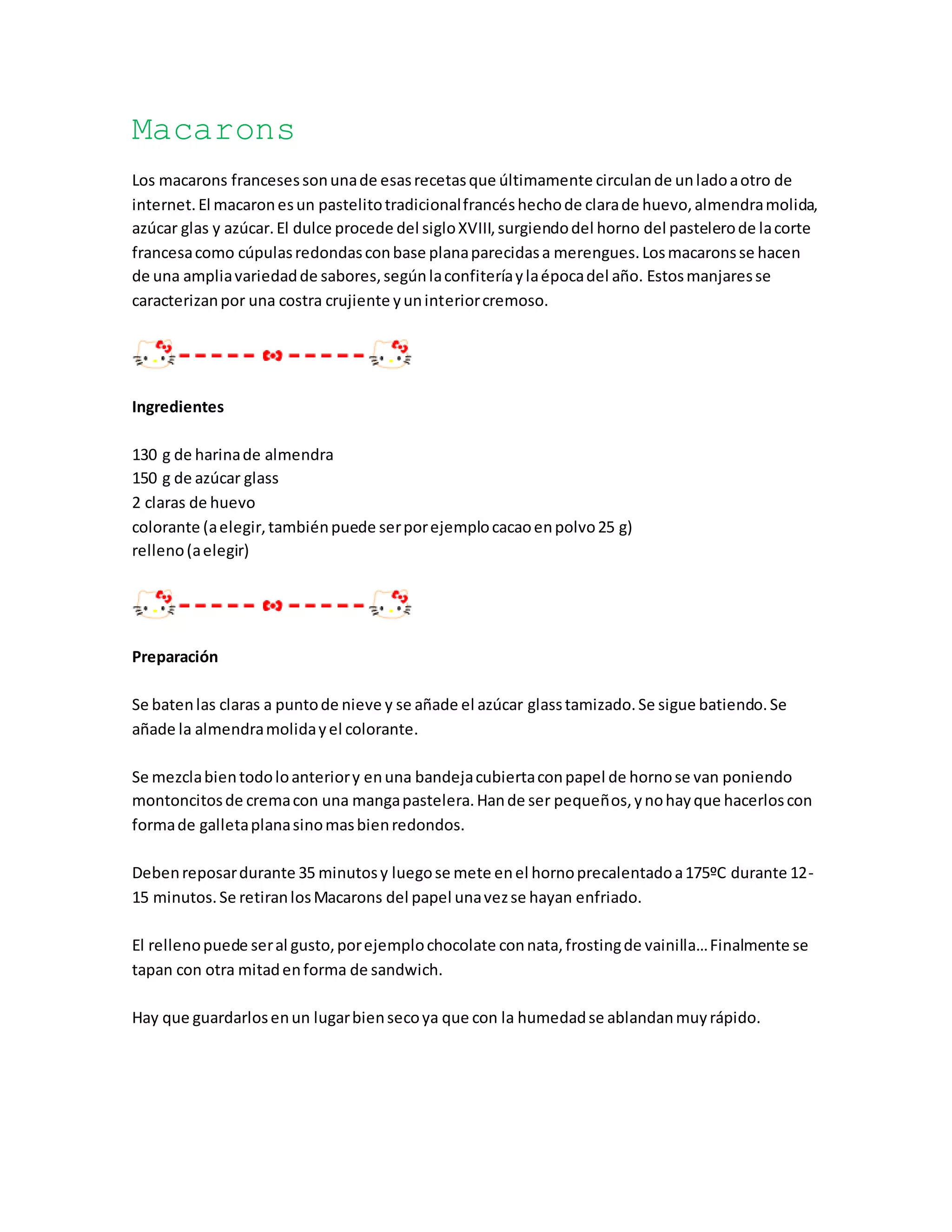 Los macarons son un pastel tradicional francés hecho de claras de huevo, almendra molida, azúcar glas y azúcar. Se originaron en el siglo XVIII en la corte francesa y se caracterizan por una costra crujiente y un interior cremoso. Para hacerlos, se baten claras a punto de nieve con azúcar glas y almendra molida, se ponen montoncitos en una bandeja para hornear y se hornean durante 12-15 minutos. Luego se rellenan al gusto y se sirven en forma de s