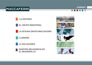 El documento presenta a Maccaferri Group, un líder mundial en soluciones de ingeniería ambiental con más de 125 años de experiencia. El grupo tiene operaciones globales a través de subsidiarias en 49 países. Ofrece una amplia gama de soluciones para proyectos de infraestructura, protección costera, rellenos sanitarios y más, enfocándose en soluciones ambientalmente responsables y económicas. También brinda servicios de diseño, capacitación y asistencia en campo para proyectos de desarrollo.