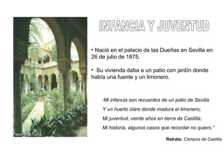 Manuel Machado nació en Sevilla en 1875. Pasó su infancia en un patio con jardín y limonero. Estudió en la Institución Libre de Enseñanza en Madrid y publicó su primera obra Soledades en 1903. En 1909 se casó con Leonor, que murió de tuberculosis en 1912, lo que le causó un gran dolor. Publicó Campos de Castilla en 1912 y se trasladó a varias ciudades. Continuó publicando poesía hasta el estallido de la Guerra Civil cuando apoyó a la República. Machado murió en
