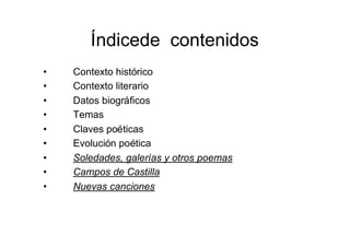 Este documento presenta un resumen biográfico y literario de Antonio Machado. Brevemente describe el contexto histórico y literario en el que se desarrolló su obra, ofreciendo datos sobre el modernismo y la generación del 98. A continuación resume los datos biográficos más relevantes de Machado y los temas y evolución de su poesía, desde las primeras obras influenciadas por el modernismo hasta su compromiso político y poesía de la guerra civil. Finalmente, analiza brevemente algunas de sus obras más importantes como Soledades y Camp