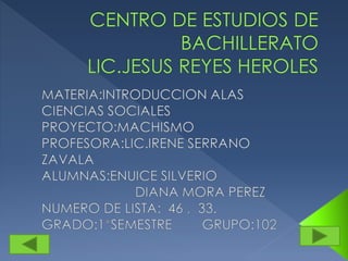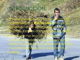 Este documento trata sobre el machismo y cómo se ha desarrollado en las familias a lo largo de los años. Define el machismo como actitudes y comportamientos que menosprecian la dignidad de la mujer en comparación con el hombre, así como acciones discriminatorias y de dominación. Explica que el machismo a menudo se origina en el seno familiar y es alimentado por la educación desde una edad temprana, y que a pesar de los esfuerzos para reducirlo, el machismo sigue existiendo hoy en día aunque de forma más sutil e invisible.