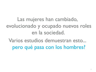 Este documento presenta los resultados de un estudio realizado en 5 países de Latinoamérica sobre los cambios en los roles y percepciones de los hombres. Algunos hallazgos clave son: 1) Los hombres chilenos son los que más han cambiado sus roles y están más contentos con estos cambios; 2) Los hombres ven positivamente el nuevo rol de la mujer y tienen buenas relaciones con sus parejas; 3) Los chilenos son los más preocupados por problemas laborales aunque en general los hombres tienen miedos similares.