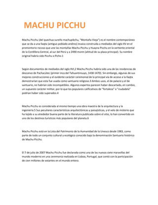 Machu Picchu fue una residencia de descanso del inca Pachacútec en el siglo XV y también se usó como santuario religioso. Se considera una obra maestra de la arquitectura y la ingeniería inca debido a su ubicación estratégica en la montaña y sus construcciones únicas. Actualmente es uno de los destinos turísticos más populares del mundo y forma parte del Patrimonio de la Humanidad de la UNESCO.