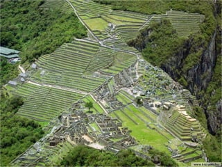 El documento describe una imagen oculta en las ruinas de Machu Picchu. Al girar la foto de las ruinas, se revela la forma de un rostro humano formado por las montañas detrás. Esto demuestra la habilidad de los incas como escultores de la naturaleza o sugiere que la naturaleza misma tomó esta forma. El documento concluye instando a los lectores a promover Machu Picchu para aumentar el turismo en el sitio.