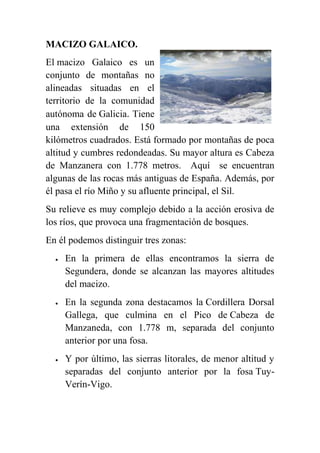 El Macizo Galaico es una región montañosa no alineada de 150 km2 ubicada en Galicia, España. Está formado por montañas redondeadas de baja altitud, siendo su punto más alto el Cabeza de Manzanera a 1778 metros. El relieve es complejo debido a la erosión de ríos como el Miño y su afluente el Sil. La región se divide en tres zonas: la sierra de Segundera con las mayores alturas, la Cordillera Dorsal Gallega que culmina en Cabeza de Manzanera, y las s