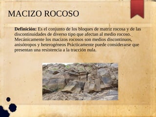 El documento describe los conceptos básicos de los macizos rocosos, incluyendo su definición, composición y propiedades. Explica que los macizos rocosos son medios discontinuos, anisótropos y heterogéneos compuestos de matriz rocosa y discontinuidades. También describe las cinco etapas clave para la evaluación de macizos rocosos: descripción general, división en zonas, descripción detallada de cada zona, parámetros del macizo y clasificación geomecánica. El objetivo final es conocer y