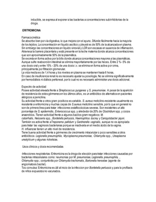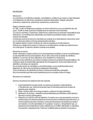 Los macrólidos son antibióticos naturales, semisintéticos y sintéticos que se usan para tratar infecciones bacterianas. La eritromicina fue el primer macrólido aislado, y derivados como la claritromicina y azitromicina tienen mejor penetración tisular. Actúan inhibiendo la síntesis proteica bacteriana al unirse al ribosoma. Se usan para tratar infecciones respiratorias, de piel y partes blandas. La claritromicina tiene un espectro más amplio que la eritromicina y se