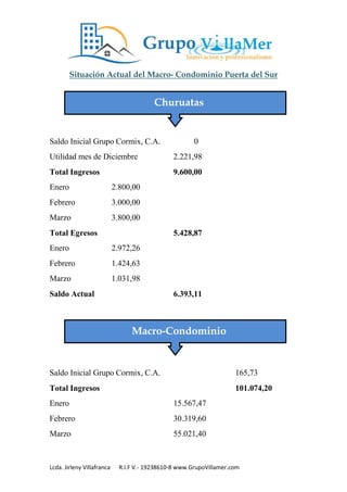 El documento resume la situación financiera de dos condominios, Churuatas y Macro-Condominio Puerta del Sur, en marzo de 2012. Reporta los saldos iniciales, ingresos, egresos y saldos actuales para cada condominio. También incluye tablas con deudas por cobrar y pagar de cada condominio.