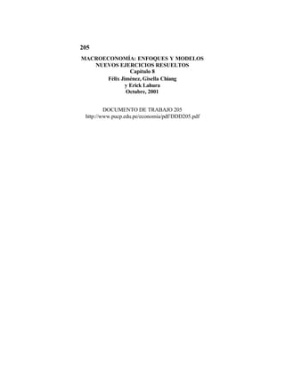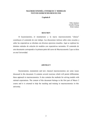 Este documento presenta varios ejercicios resueltos relacionados con diferentes escuelas de pensamiento macroeconómico como el keynesianismo, el monetarismo y la nueva macroeconomía clásica. Explica conceptos como expectativas adaptativas y racionales, y modelos dinámicos de oferta y demanda agregada. Además, analiza temas como la curva de Phillips, la dinámica de la inflación y el desempleo, y las críticas de Lucas a los modelos keynesianos tradicionales. El contenido forma parte