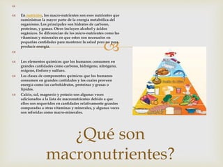  ¿Qué son macronutrientes?   Ennutrición, los macro-nutrientes son esos nutrientes que suministran la mayor parte de la energía metabólica del organismo. Los principales son hidratos de carbono, proteínas, y grasas. Otros incluyen alcohol y ácidos orgánicos. Se diferencian de los micro-nutrientes como las vitaminas y minerales en que estos son necesarios en pequeñas cantidades para mantener la salud pero no para producir energía.   Los elementos químicos que los humanos consumen en grandes cantidades como carbono, hidrógeno, nitrógeno, oxígeno, fósforo y sulfuro.  Las clases de componentes químicos que los humanos consumen en grandes cantidades y los cuales proveen energía como los carbohidratos, proteínas y grasas o lípidos.  Calcio, sal, magnesio y potasio son algunas veces adicionados a la lista de macronutrientes debido a que ellos son requeridos en cantidades relativamente grandes comparadas a otras vitaminas y minerales, y algunas veces son referidas como macro-minerales.