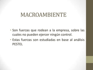 El documento resume los factores del macroambiente que afectan a las empresas. Estos factores incluyen fuerzas políticas, económicas, socioculturales, tecnológicas, ecológicas y legales que están fuera del control de las empresas pero influyen en sus decisiones de mercadeo. Algunos ejemplos son las tasas de inflación, valores sociales, evolución tecnológica, conciencia ecológica y leyes laborales.