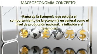 El documento define los conceptos fundamentales de la macroeconomía como el estudio de las variables agregadas de una economía a nivel nacional como el PIB, el empleo, los precios y la balanza de pagos. Explica que la macroeconomía puede usarse para influir en objetivos políticos como el crecimiento económico, la estabilidad de precios y el empleo. También define conceptos como la inflación, la tasa de cambio y el flujo circular de la renta.