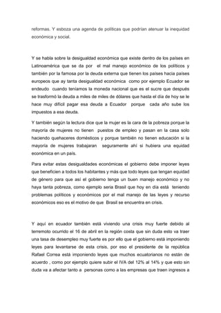 El documento analiza la relación entre las políticas macroeconómicas, el desarrollo y el género en América Latina. Señala que las reformas de políticas monetarias, fiscales y financieras promovidas por el Consenso de Washington profundizaron la desigualdad económica y social entre géneros. También discute cómo la deuda externa y la falta de equidad de género han contribuido a la pobreza. Finalmente, sugiere que los gobiernos deben establecer leyes que promuevan