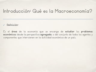 Este documento proporciona una introducción a los conceptos macroeconómicos básicos como la macroeconomía, el PIB y la renta nacional. Explica que la macroeconomía estudia la economía de manera agregada, y define el PIB como la medición del valor de todos los bienes y servicios finales producidos en un país en un período. Luego describe los tres métodos para calcular el PIB - gasto, valor añadido e ingresos - y las diferentes variaciones del PIB como el nominal, real y bruto. Finalmente, introduce la renta n