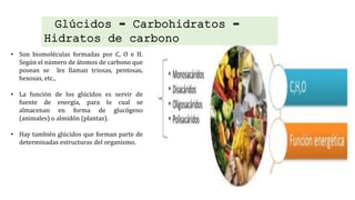 Este documento resume los principales tipos de nutrientes: carbohidratos, lípidos, proteínas y ácidos nucleicos. Los carbohidratos incluyen monosacáridos como la glucosa, disacáridos como la sacarosa, y polisacáridos como el almidón y el glucógeno. Los lípidos incluyen ácidos grasos, triglicéridos y colesterol. Las proteínas están formadas por aminoácidos unidos por enlaces peptídicos. Los ácidos nucleicos, ADN y ARN, cont