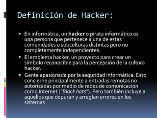Este documento define varios términos relacionados con la seguridad informática como hacker, cracker, virus informático y tipos de virus. Explica que un hacker es alguien apasionado por la seguridad informática, mientras que un cracker rompe sistemas de seguridad por diversas razones. Un virus informático altera el funcionamiento de una computadora sin permiso y puede incluir gusanos, caballos de Troya, virus de arranque, archivos y macros.