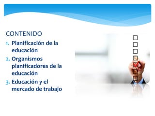 Este documento trata sobre la macro-planeación de la educación en México. Explica que la planeación educativa implica definir objetivos, planes y estrategias a corto, mediano y largo plazo para alcanzar las metas educativas. También describe los organismos planificadores de la educación en México y cómo la educación debe analizarse en el contexto de la estructura social, política y económica del país.