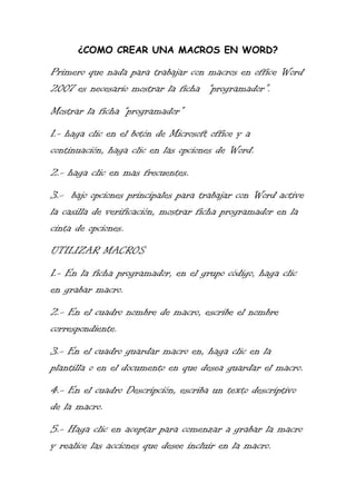 Este documento proporciona instrucciones en 3 pasos para mostrar la ficha "Programador" en Word 2007 y habilitar las macros. Luego explica un proceso de 5 pasos para grabar una macro en Word, que incluye darle un nombre, seleccionar una ubicación de almacenamiento, agregar una descripción y grabar las acciones.