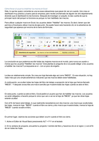 El documento describe cómo forzar a los usuarios a habilitar las macros en Excel creando una hoja de inicio que es la única visible y ocultando las demás hojas. Se proporcionan instrucciones para escribir dos macros, una para ocultar hojas al cerrar el libro excepto la hoja de inicio y otra para mostrar las hojas al abrir el libro excepto la hoja de inicio, forzando así a los usuarios a habilitar las macros para poder ver el contenido. Se sugiere una alternativa que oculta todas las hojas excepto la de inicio sin macros.