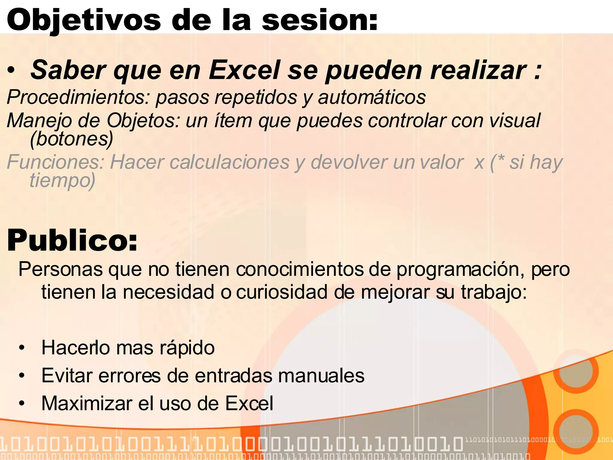 El documento aborda el uso de macros en Excel a través de Visual Basic para Aplicaciones, dirigido a personas sin experiencia en programación que buscan optimizar su trabajo. Se discuten conceptos básicos como grabar, ejecutar y editar macros, así como la utilización de instrucciones y condiciones lógicas. Finalmente, se presentan ejercicios prácticos para aplicar esos conocimientos, incluyendo la creación de macros específicas y la manipulación de objetos dentro de Excel.