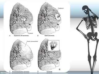 Este documento proporciona instrucciones para la macroscopía del pulmón, incluyendo la descripción del peso y tipo de resección del pulmón, características de la pleura y el tumor, apariencia del pulmón no neoplásico, ganglios linfáticos y secciones recomendadas para estudio histológico. También brinda detalles sobre las características macroscópicas comunes de varios tipos de tumores pulmonares y el informe patológico.