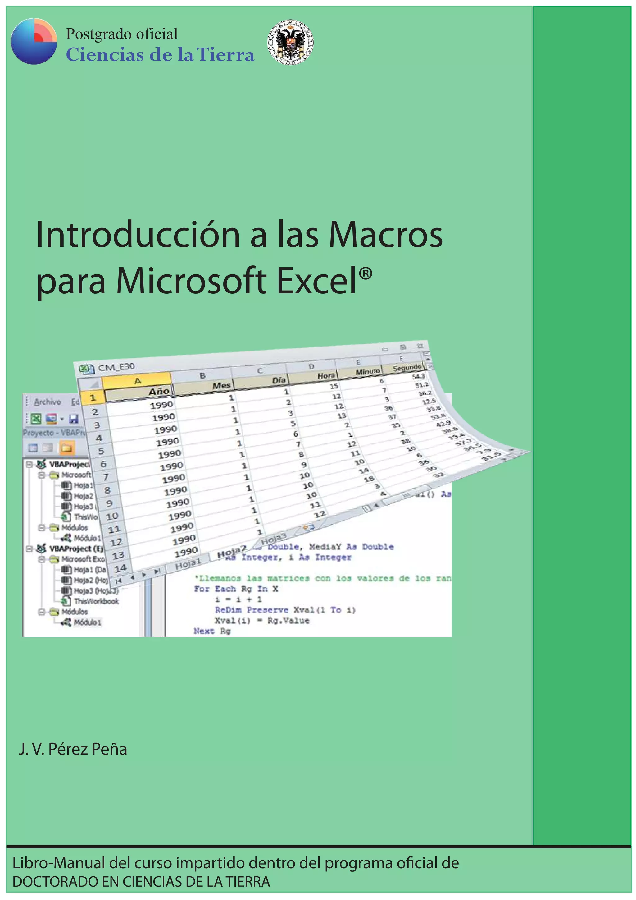 Este documento presenta un manual sobre macros en Microsoft Excel. En la introducción se define qué son las macros y cómo se crean utilizando el lenguaje de programación Visual Basic for Applications integrado en Excel. Luego, en la primera parte del manual, se explican conceptos básicos de programación como variables, instrucciones lógicas y bucles. La segunda parte introduce conceptos de programación orientada a objetos y los principales objetos de Excel que pueden ser manipulados mediante macros. El manual contiene ejemplos prácticos de macros sencillas y constituye una guía para aprender a