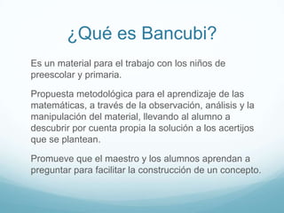 Bancubi es un material educativo para el aprendizaje de las matemáticas a través de la observación, análisis y manipulación de cubos. El método promueve que maestros y alumnos aprendan mediante la formulación de preguntas para descubrir conceptos por sí mismos siguiendo reglas como respetar los turnos y no usar la palabra "no" cuando otros piensan. El trabajo con Bancubi implica etapas como explorar pensamientos, presentar conceptos, construirlos y cerrar la lección.