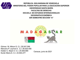 Madagascar, situada en el océano Índico, es una república semipresidencial con una población de aproximadamente 28.4 millones de habitantes y una economía basada en la agricultura, la pesca y la producción de textiles. Su biodiversidad y riqueza en flora y fauna son puntos turísticos clave, aunque el país enfrenta altos niveles de pobreza y un bajo PIB. Actualmente, el gobierno promueve el turismo como estrategia para el desarrollo económico.