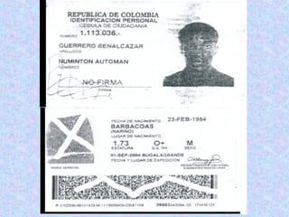 El documento describe a Colombia como un país donde hay trabajo para todos, ingenieros mecánicos de calidad y originalidad a pesar de las malformaciones. También destaca que en Colombia hay esperanzas y especificidad, trillizos, y que sus ciudadanos entienden mejor las señales de tránsito y se preocupan por los animales.