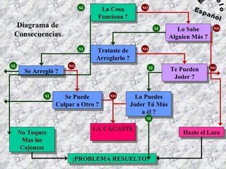 El documento presenta un diagrama humorístico sobre las consecuencias de las acciones tomadas para solucionar un problema. Incluye preguntas retóricas que sugieren diferentes enfoques ante situaciones de fallos o errores. El tono es desenfadado y utiliza el humor para ilustrar la dinámica de culpa y responsabilidad.