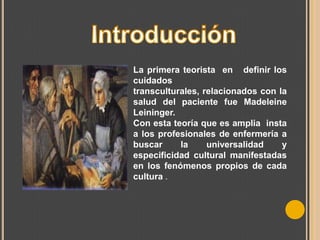 La teoría de enfermería transcultural de Madeleine Leininger se basa en la antropología y en la enfermería. Define la enfermería transcultural como un área de estudio y práctica que se enfoca en el cuidado holístico y comparativo de personas de diversas culturas. Leininger desarrolló esta teoría para instar a los profesionales de enfermería a buscar tanto la universalidad como la especificidad cultural en los cuidados de salud.