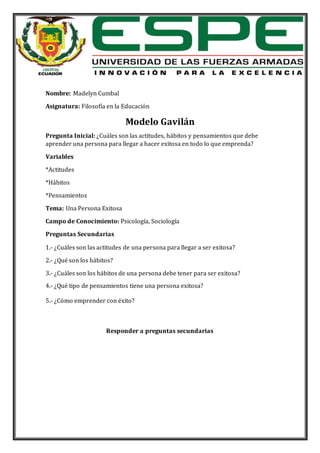 Este documento resume las actitudes, hábitos y pensamientos que debe tener una persona para ser exitosa. Entre las actitudes se encuentran tener una actitud positiva, de lucha, visión de futuro y responsabilidad. Los hábitos incluyen practicar ejercicio, gestionar bien el tiempo, educarse continuamente y mejorarse constantemente. Finalmente, los pensamientos de una persona exitosa son pensar en grande, en su equipo y aprender continuamente.
