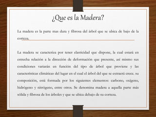 El documento describe las propiedades de la madera. Explica que la madera es la parte más dura y fibrosa del árbol ubicada debajo de la corteza y se caracteriza por su elasticidad. Luego enumera y explica varias propiedades físicas y mecánicas clave de la madera como la higroscopicidad, anisotropía, densidad, dureza, resistencia a la tracción, compresión y flexión.